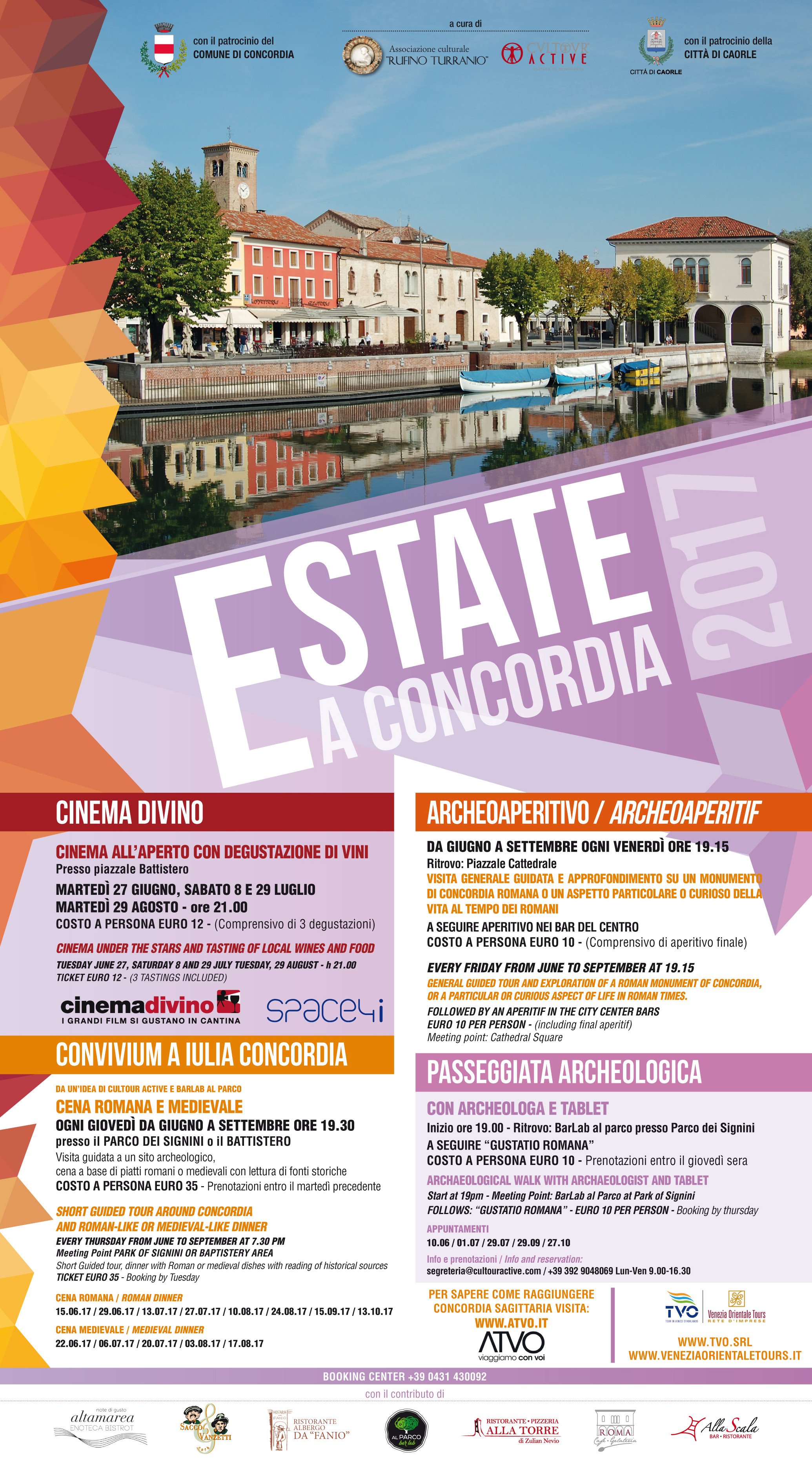 Da giugno a settembre, l’estate di Concordia Sagittaria è ricca di eventi. Da metà giugno, infatti, prenderanno il via due importanti iniziative: Convivium a Iulia Concordia e gli Archeoperitivi. La prima proposta, curata dall’Ass. Cultour Active con il patrocinio dell’Amministrazione comunale, prevede una visita guidata ad un sito con un archeologo, la cena, romana o medievale in alternanza, e delle letture di varie fonti storiche di autori (romani o medievali) che parlano di cibo. L’appuntamento è fissato per tutti i giovedì sera fino a settembre: per prenotare (non oltre il martedì sera) chiamare al numero 0431 430092. Ogni venerdì sera, invece, è tempo di Archeoaperitivi. I partecipanti all’iniziativa, curata dall’Ass. Rufino Turranio, saranno guidati in una breve visita guidata, caratterizzata da vari approfondimenti sulla vita romana di un tempo, per poi proseguire con un aperitivo nei bar del centro. Vi sarà anche la possibilità di cenare a Concordia con prezzi agevolati. La stagione prevede incontri adatti al palato dei più golosi: cene romane e medievali si alterneranno nelle settimane a “Gustatio” ossia passeggiate archeologiche con degustazioni di antichi cicchetti, e Cinema con presentazioni di vini d’eccellenza del territorio.